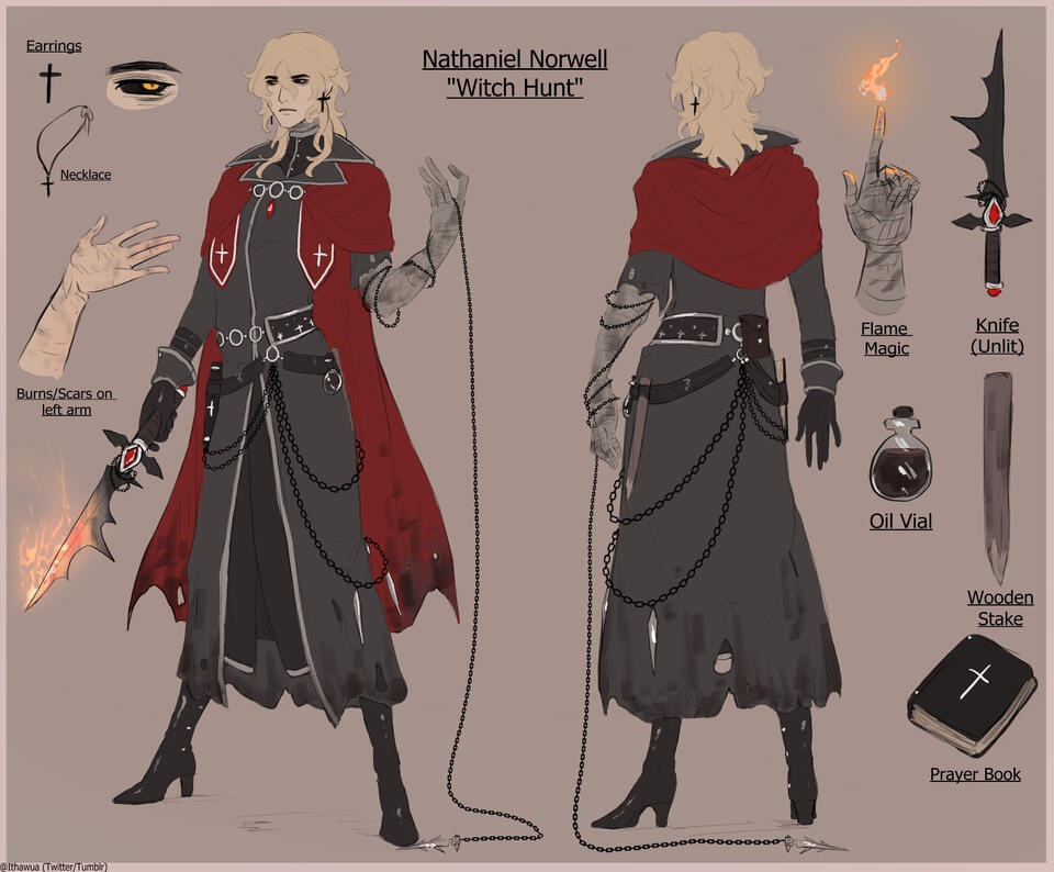 After being killed by his twin brother, Nathaniel was revived through the power of a 'miracle' by his father, Noel Norwell. He was never told the methods of which this miracle took place, only that his grieving father did everything in his power to bring his late son back to life. Nathaniel promised to not squander this chance, and worked hard to gain the strength necessary to protect himself, his family, and his village from 'evil'.His methods are cruel and sadistic, and his ultimate goal is to eventually hunt down "The Walking Death" (Ithaqua) and put an end to him.Eventually, however, he and Ithaqua both will end up participating in the manor's events, where they begrudgingly are forced to work together, and share a room due to the cruel joke of the manor's baron.